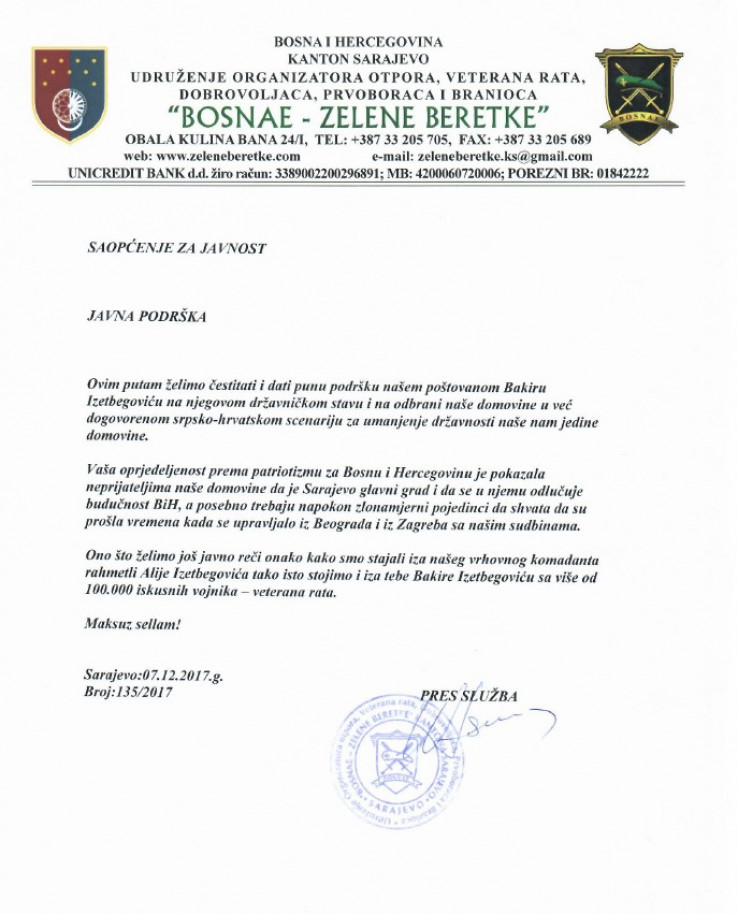 Ono što želimo još javno reći, onako kao smo stajali iza našeg vrhovnog komandanta rahmetli Alije Izetbegovića, poručuju iz “Zelenih beretki”, tako stojimo i iza tebe, Bakire Izetbegoviću, sa više od 100.000 iskusnih vojnika – veterana rata – navodi se na kraju saopćenja Udruženja organizatora otpora, veterana rata, dobrovoljaca, prvoboraca i branioca “BOSNAE – ZELENE BERETKE”.