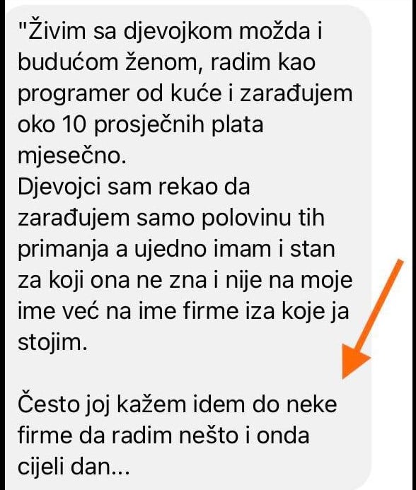 Djevojci sam rekao da zarađujem samo polovinu tih primanja a ujedno imam i stan za koji ona ne zna i nije na moje ime već na ime firme iza koje ja stojim.