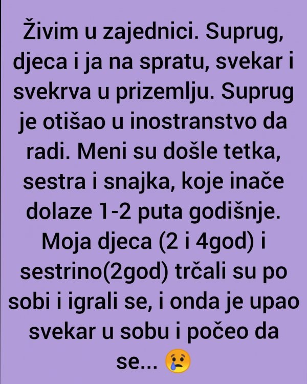 Živim u zajednici. Suprug, djeca i ja na spratu, svekar i svekrva u prizemlju. Suprug je otišao u inostranstvo da radi. Meni su došle tetka, sestra i snajka, koje inače dolaze 1-2 puta godišnje. Moja djeca (2 i 4god) i sestrino(2god) trčali su po sobi i igrali se, i onda je upao svekar u sobu i počeo da se …