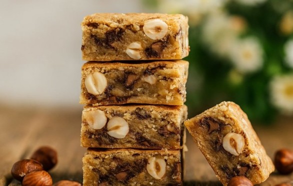 U velikoj činiji otopite puter. Dodajte smeđi šećer, jaja, žumanca, puter od lešnika i vanilu. Mutite mikserom 2–3 minuta, dok smesa ne postane svetla i kremasta. Dodajte suve sastojke. Prosejte brašno i umešajte ga u smesu. Potom dodajte većinu čokolade i lešnika, a malo ostavite za posipanje. Pecite. Sipajte testo u pleh, poravnajte i pospite preostalim čokoladom i lešnicima. Pecite 30–35 minuta, dok kolač ne dobije zlatnu boju, a sredina ostane mekana. Ohladite i isecite. Potpuno ohladite u plehu, zatim izvadite pomoću papira i isecite na kvadrate.
